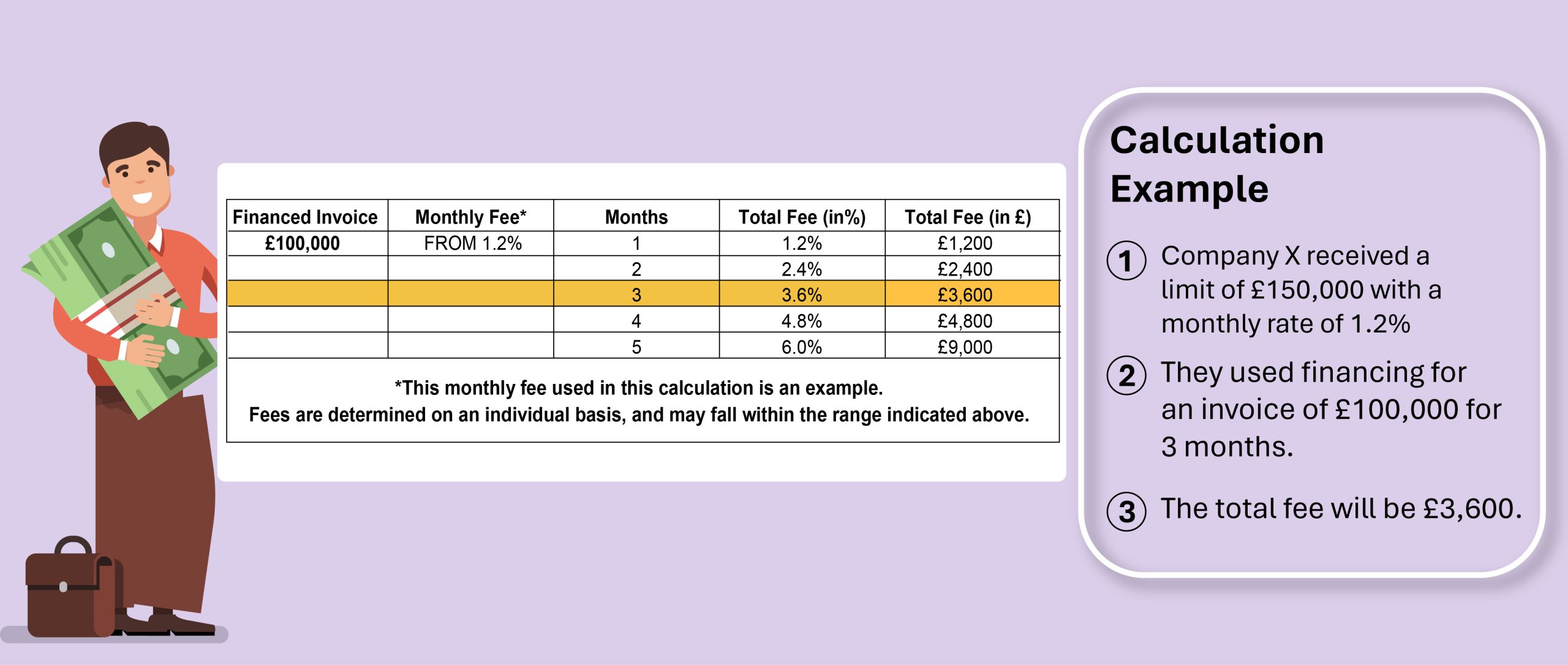 Fees typically range from 1.2% to 3% per month, based on your financials.